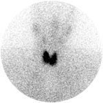La segunda vía de tratamiento de la tirotoxicosis es la destrucción de tejido tiroideo con Yodo Radiactivo. Se trata de una terapia definitiva, segura y de bajo coste. Sin embargo, la destrucción del tejido tiroideo queda restringida a pacientes con bocios tiroideos difusos pequeños, que presentan contraindicaciones quirúrgicas y/o ante recidivas post-cirugia.