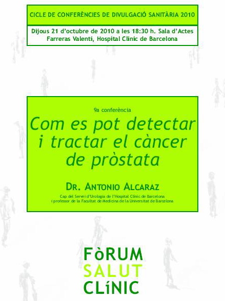 L’Hospital Clínic organitza la 9ª conferencia del Fòrum Salut Clínic, “Com es pot detectar i tractar el càncer de pròstata”, que serà impartida pel Dr. Antonio Alcaraz, cap del Servei d’Urologia de l’Hospital Clínic de Barcelona i Director del Grup de Recerca en Urologia Oncològica de l’IDIBAPS. Fòrum Salut Clínic és un cicle de conferències de divulgació sanitària que respon a la voluntat de proximitat amb els ciutadans i a la vocació docent del Clínic. Us recordem que l’entrada és lliure i no cal fer reserva.